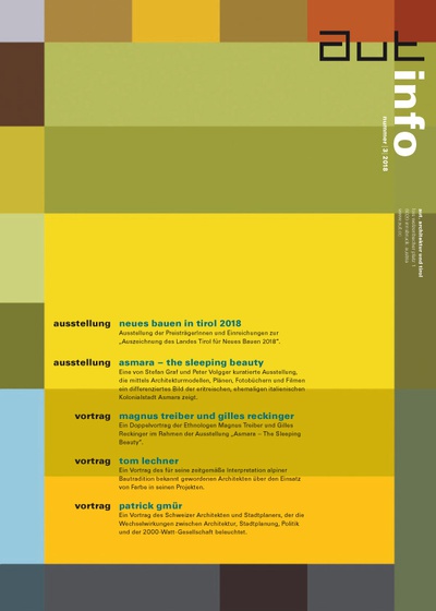 Die Ausgabe 3/18 der Programmzeitschrift aut: info mit Hintergrundinformationen zu den Ausstellungen "Neues Bauen in Tirol 2018" und "Asmara – The Sleeping Beauty" und zum Programm des aut zwischen Oktober und Dezember 2018.