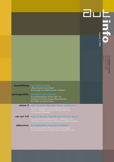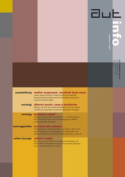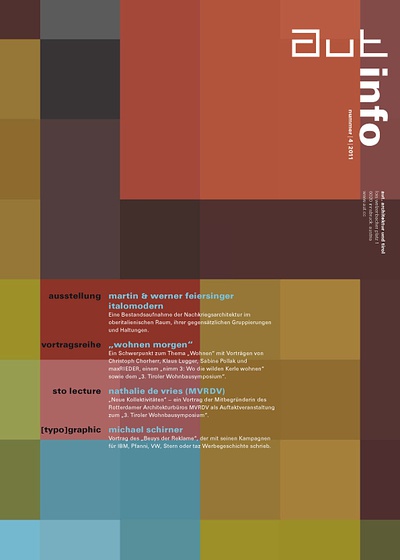 Die Ausgabe 4/11 der Programmzeitschrift aut: info mit Hintergrundinformationen zur Ausstellung "italomodern. Architektur in Oberitalien 1946-1976" und zum Programm des aut zwischen Oktober 2011 und Februar 2012.
