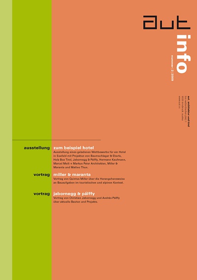 Die Ausgabe 2/09 der Programmzeitschrift aut: info mit Hintergrundinformationen zur Ausstellung „Zum Beispiel Hotel“ sowie zum Programm des aut im April und Mai 2009.