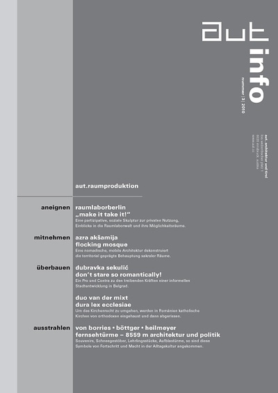 Die Ausgabe 4/10 der Programmzeitschrift aut: info mit Hintergrundinformationen zum letzten Teil der Ausstellungsreihe "aut.raumproduktion" sowie zum Programm des aut zwischen September und Dezember 2010.
