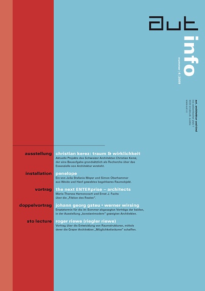 Die Ausgabe 4/09 der Programmzeitschrift aut: info mit Hintergrundinformationen zur Ausstellung von Christian Kerez und zur Installation „Penelope“ sowie zum Programm des aut zwischen Oktober und Dezember 2009.