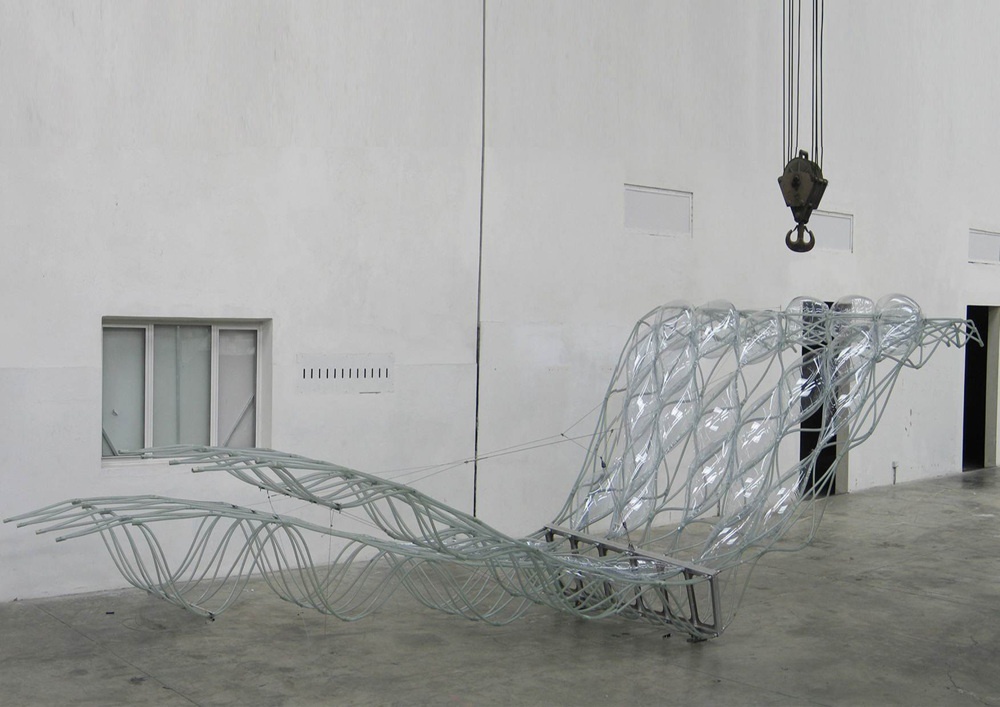 Zu neuen Entwurfsmethoden auch neue Materialien und Technologien zu entwickeln, nämlich weiche Materialien, die sich mit der gleichen Leichtigkeit biegen und formen lassen, wie die splines am Bildschirm, war mein Ziel. Den Forschungsauftrag der Universität nutzend, wurde der erste Forschungsantrag zum Thema kurzfristig formuliert und eingereicht. Das anonyme Gutachten war allerdings so negativ – man traue das vorgelegte Entwicklungsprogramm vom frei formbaren Werkstoff splineTEX zwar Chemikern zu, Architekten wären damit aber überfordert, so das Argument –, dass das Projekt die eigene Werkstatt im Keller längere Zeit nicht verlassen konnte und nur mit Hilfe von Studierenden auf freiwilliger Basis die Umsetzung eines extra großen Prototypen ermöglicht wurde. Die erste, 10 m lange, 3 m breite und 2 m hohe superTEX-Bar, eine Konstruktion aus splineTEX, sollte die Zweifler eines Besseren belehren.