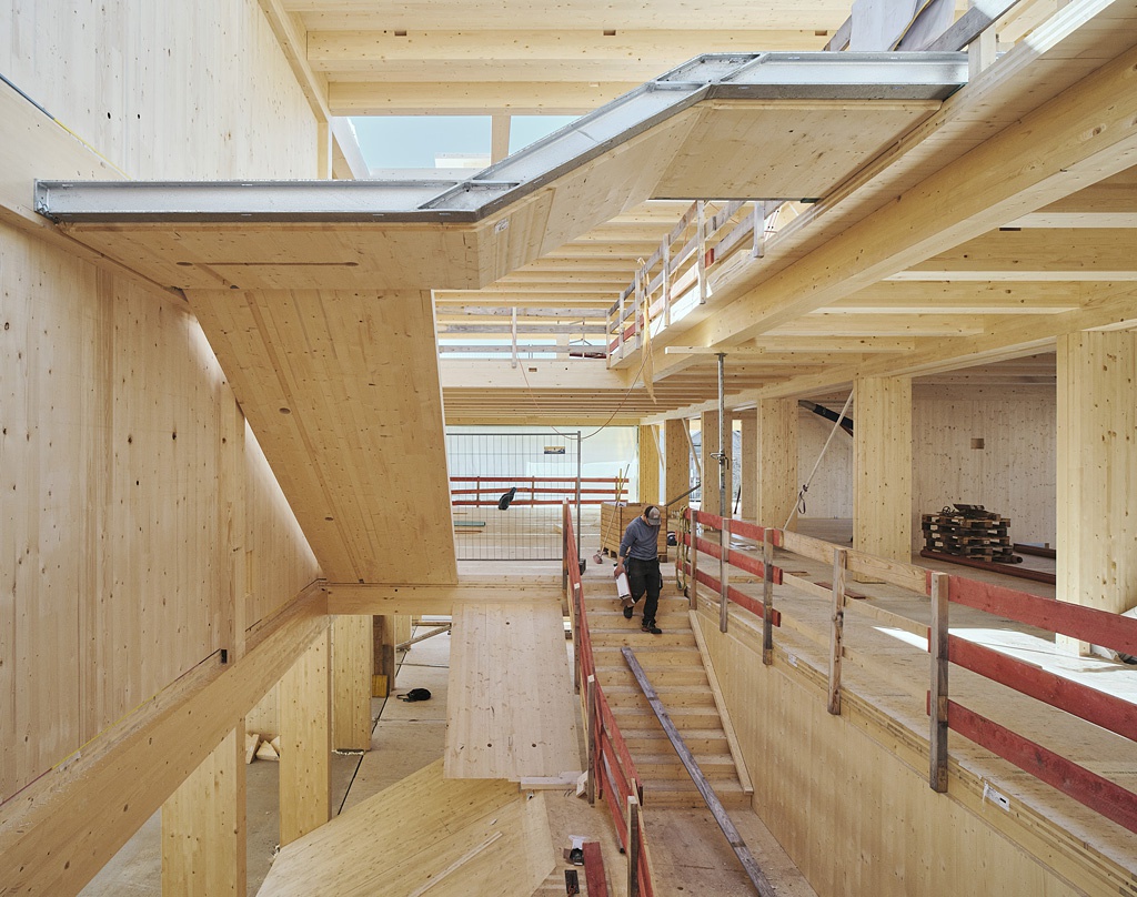 Herzstück der Schule ist ein nach oben offenes Atrium – eine zentrale, lichtdurchflutete Gebäudemitte. Im durchlässigen Erdgeschoß kommunizieren Schülergarderobe, Aula, Musikräume und Nachmittagsbetreuung mit dem öffentlichen Stadtraum. Über eine Treppenlandschaft werden die Obergeschoße mit den bewusst getrennten Verwaltungsbereichen und Lernlandschaften erschlossen, die sich sowohl zum Garten, als auch zum Atrium orientieren. Die Sportanlagen sind im Untergeschoß angeordnet, das über einen abgesenkten Gartenhof mit direktem Tageslicht versorgt wird.