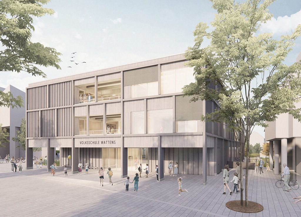 Am Kirchplatz im Zentrum von Wattens wird 2026 eine neue Volksschule mit 11 Klassen, Aula, Mittagstisch und Turnhalle in Betrieb genommen. Mit einem einfachen und klaren, über dem Haupteingang auskragenden Baukörper konzipierten die Architektinnen einen Gegenpol zur gegenüberliegenden Mittelschule, der sich selbstbewusst in die heterogene Bebauung einfügt und viel Platz für einen qualitätsvollen Freiraum lässt.