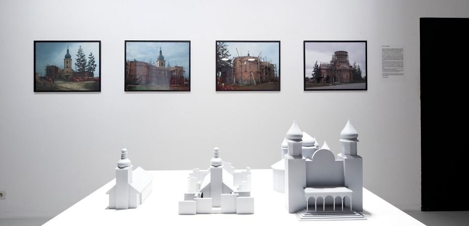 Ihr im aut gezeigtes Projekt „Dura Lex Ecclesiae“ - eine Installation aus drei Architekturmodellen und drei digitalen Prints" - geht einer in Rumänien weit verbreiteten, eigenwilligen Praxis der Überbauung alter katholischer Kirchen nach. Da es das Kirchenrecht verbietet, Gotteshäuser abzureißen, jedoch Veränderungen jedweder Art im Innenraum erlaubt, wurde in Ungheni nach gängiger Manier die neue orthodoxe Kirche kurzerhand über die alte katholische gebaut: Sobald der Neubau abgeschlossen ist, befindet sich die alte Kirche in dessen Innenraum und kann dann ohne Weiteres abgerissen werden.