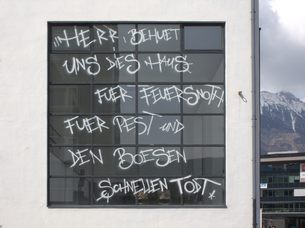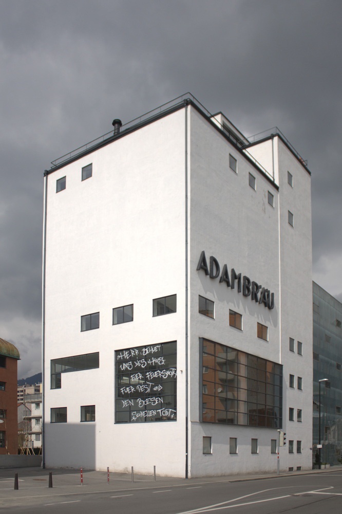 Im Rahmen der Ausstellung "Michl Schmidt + Peter Wendl: Verteidigung des Normalzustands" erhielt das Adambräu-Gebäude einen Haussegen. Ausstellung im aut bis 3. Juli 2010