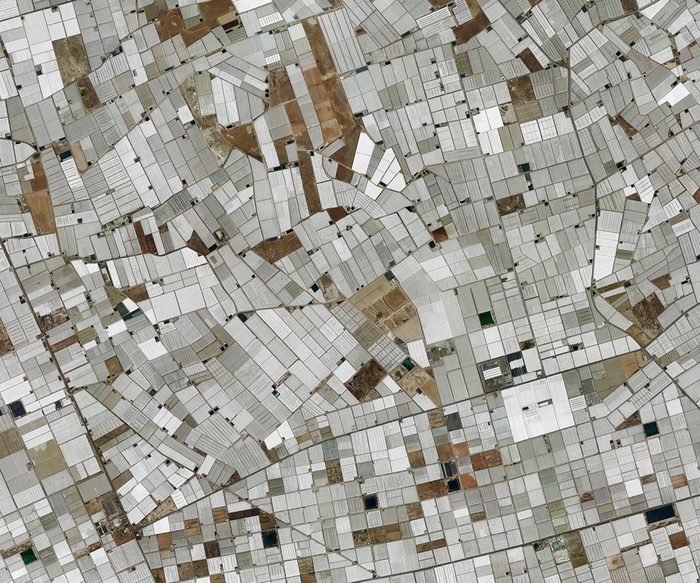 Durch den Wechsel zwischen Distanz und Nähe offenbaren sich in Engels Fotografien entweder kleinste Details oder es dominieren großflächige Muster. So werden Siedlungsstrukturen zu einem ornamentalen Gewebe aus verwobenen Linien, die Flachdächer unzähliger Gewächshäuser zu einem dichten, teppichartigen Mosaik. Die Grüns eines Golfkurses in einer nackten, felsigen Landschaft erinnern plötzlich an eine ausgestreckte Hand und die Ränder künstlich bewässerter Felder gehen für einen Moment als Muster von Pailletten auf einem dekorativen Stoff durch. Der „göttliche Blick“ von oben vermittelt eine Abstraktion in Linien und Flächen, eine Über-Realität, die man so nie sehen oder erleben kann.