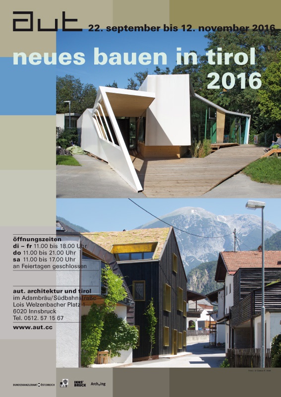 ausstellung Ab dem Abend der Preisverleihung sind sämtliche zur "Auszeichnung des Landes Tirol für Neues Bauen 2016" eingereichten Projekte im aut zu sehen. Jedes Projekt wird auf bis zu fünf A4 Tafeln vorgestellt, die Preisträger-Projekte auf Wandtafeln mit großformatigen Bildern und der Jurybegründung. Damit bietet die Ausstellung der interessierten Öffentlichkeit eine sehr gute Gelegenheit, sich einen Überblick über das aktuelle Architekturgeschehen in Tirol zu verschaffen.