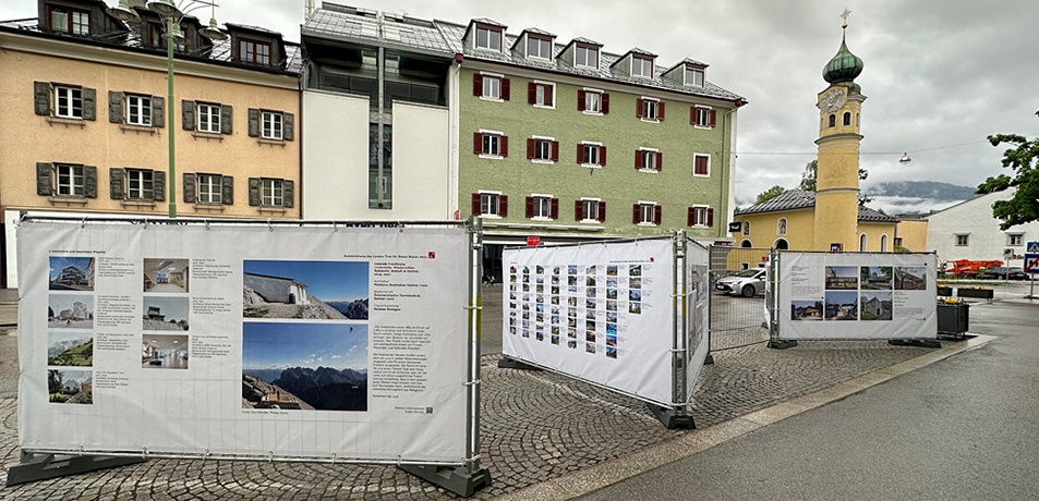 Die begleitende Ausstellung „Neues Bauen in Tirol“ tourt seit 2019 mit Unterstützung der Kammer durch Tirol, womit sich die interessierte Öffentlichkeit nicht nur in der Landeshauptstadt einen Überblick über das aktuelle Architekturgeschehen in Tirol verschaffen kann. In Kooperation mit lokalen Initiativen im Bereich der Baukulturvermittlung war die Ausstellung 2019 im Campus Technik Lienz und in der Fachhochschule Kufstein zu sehen, 2021 kamen Neustift im Stubaital und Telfs hinzu. In diesem Jahr war „Neues Bauen in Tirol“ erstmals in einer eigens für den öffentlichen Raum konzipierten Version unterwegs und wurde – begleitet von mehreren Rahmenveranstaltungen – im Hof der Bezirkshauptmannschaft in Schwaz, am Hauptplatz von Lienz, in Mieders im Stubaital, am Brunnenhaus in Fließ und am Oberen Stadtplatz in Kufstein gezeigt.