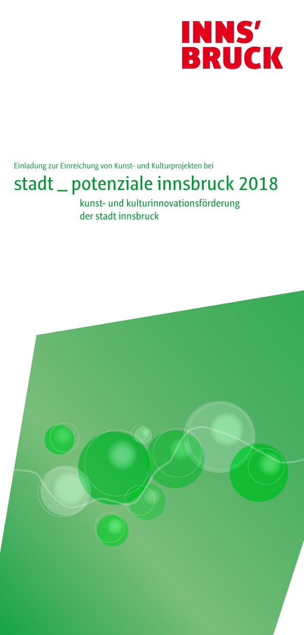 Projekte für stadt_potenziale 2018 können bis 30. November 2017 im Kulturamt der Stadt Innsbruck eingereicht werden. Eine unabhängige Jury wird Anfang Februar 2018 in einer öffentlichen Jurysitzung über die Vergabe und Förderhöhe der Siegerprojekte entscheiden.