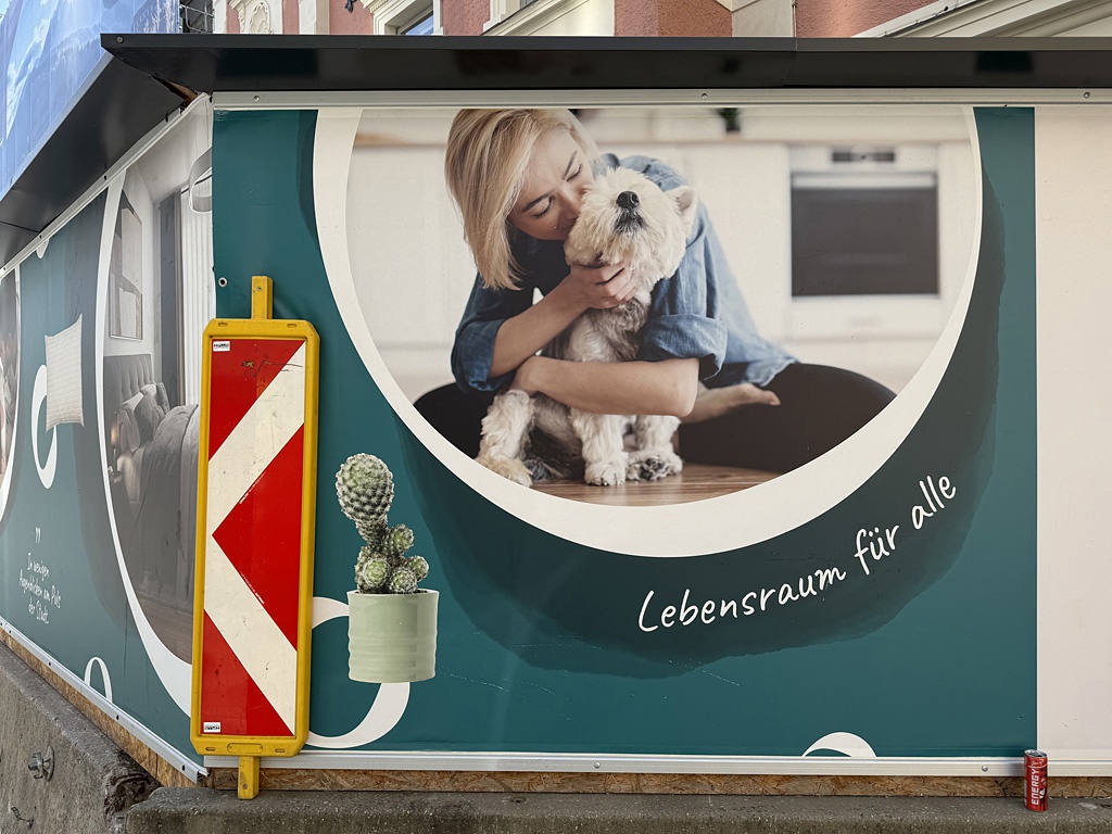 Siehe Innsbruck, wo man sich nur auf den Werbebannern an Baustellen oder auf den Websites der Immobilienentwickler umschauen muss, um zu beobachten, was man der Sprache an plumpen Floskeln und leeren Worthülsen alles abpressen kann. Von den obligatorischen Anglizismen, dem „Quality Living“ in „Hideaways“, „Hill Top Residencies“ oder „Skylofts“, und von der häufig bemühten „zeitlosen Architektur mit Haltung“ und „zeitlosen Eleganz“ einmal abgesehen, haben vor allem auch die Sinnsprüche auf den Plakaten und Aufsätze in den Exposés einiges zu bieten, das an unfreiwillige Satire grenzt. „Lebensraum für alle“ war zuletzt vor der Baustelle in der Lieberstraße zu lesen, allerdings nicht in Gestalt eines Graffitos, das die horrenden Preise auf dem Wohnungsmarkt kritisiert, sondern auf einem Plakat des Bauträgers, der hier Luxuswohnungen errichtet (Penthouse-Preis: 2,15 Millionen Euro). Womöglich sollen sich von dem vollmundigen Versprechen ja in erster Linie Haustierbesitzer angesprochen fühlen, die Abbildung zeigt jedenfalls eine Dame mit Hund.