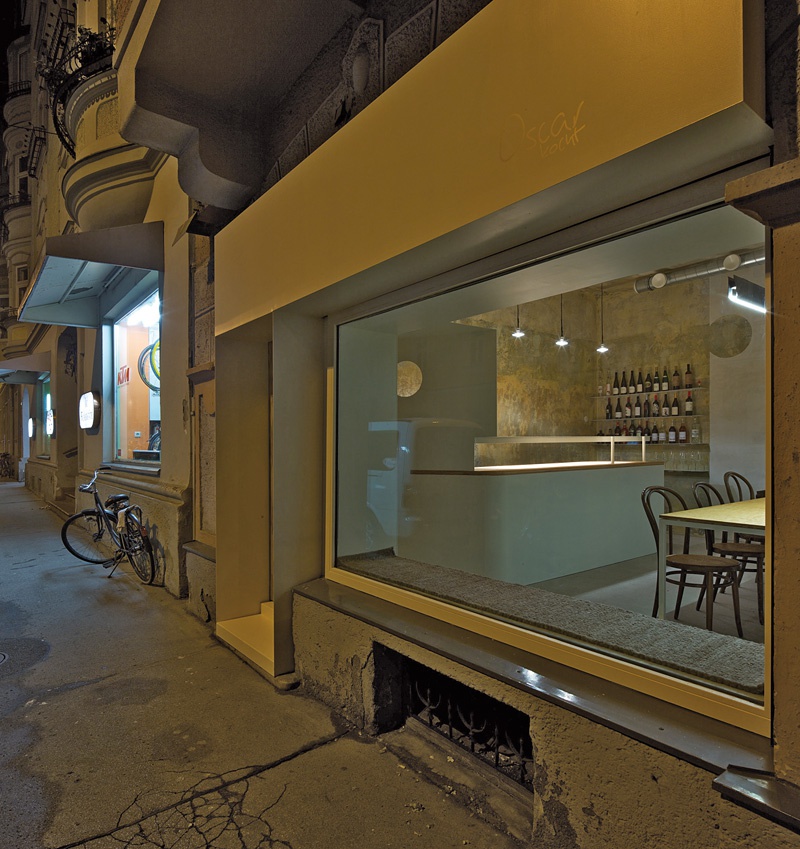 Seine ArchitektInnen Teresa Stillebacher und Christian Dummer kannten Oscar Germes schon lange, Teresa aus einer Wohngemeinschaft. Sie befreiten den 4,50 x 5,00 m großen und 3,30 m hohen Raum mit seinem großen Panzerglasfenster mit niederem Parapet und hohem Sturz zur Straße von den im Lauf der Jahrzehnte aufgebrachten Vorsatzschalen, abgehängten Decken, Bodenbelägen und Farbschichten und legten die Ursprungsbemalung frei. Danach wurden die dem Essbereich zugeordneten Wände und Wandteile mit naturweißer Spachtelung überzogen. Durch das Auffinden eines Frieses aus Frauenköpfen entstand ein wichtiges Detail: Die Rückwand teilt sich im Drittel in eine verspachtelte weiße und ursprünglich gelb-braun-grünliche Wand. Einer dieser Frauenköpfe an der Farbgrenze wird in der gespachtelten Fläche – wie ein verbindendes „Gelenk“ – durch einen offenen Dreiviertelkreis ausgespart. Dieses „Verklammern“ von Ess- und Kochbereich ist von der Grundstruktur bereits durch die einander diagonal gegenüberliegenden Zugänge – dem Eingang und der Öffnung zu den Lokalnebenräumen – gegeben.