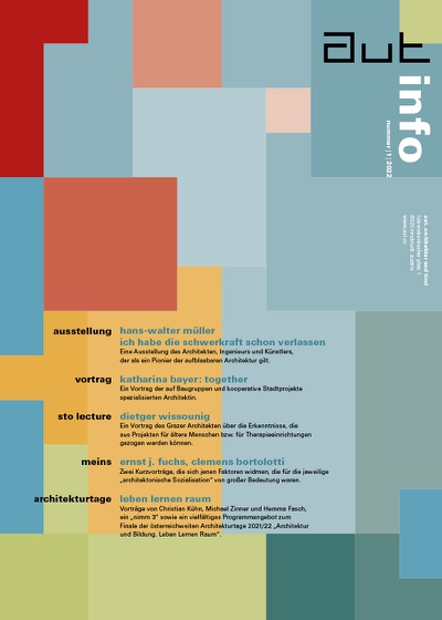 Die Ausgabe 2/21 der Programmzeitschrift aut: info mit Hintergrundinformationen zur Ausstellung "Die Körper und der Raum. 114 Beiträge zu einer sinnlichen Erkenntnis" und viel Lesestoff zu Architektur und Tirol.