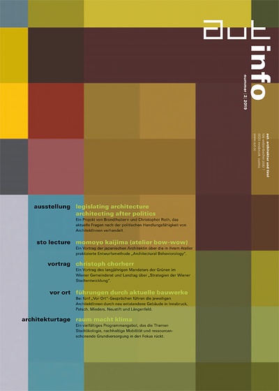 Die Ausgabe 2/19 der Programmzeitschrift aut: info mit Hintergrundinformationen zur Ausstellung "Legislating Architecture" und zum Programm des aut zwischen März und Juni 2019.