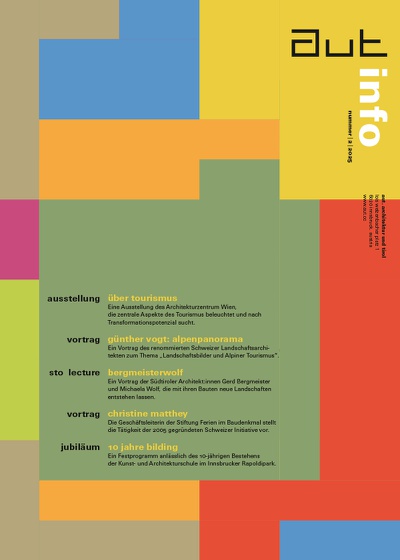 Die Ausgabe 3/22 der Programmzeitschrift aut: info mit Hintergrundinformationen zu den Ausstellungen "Neues Bauen in Tirol 2022" und "Reinhold Adolf: Schwingen und Entspannen" sowie zum Programm des aut zwischen November 2023 und Feber 2023.