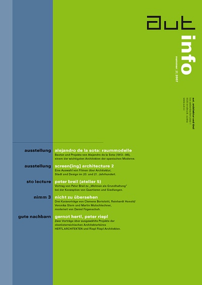 Die Ausgabe 2/07 der Programmzeitschrift aut: info mit Hintergrundinformationen zu den Ausstellungen „Alejandro de la Sota: Raummodelle“ und „screen[ing] architecture 2“ sowie zum Programm des aut zwischen März und April 2007.