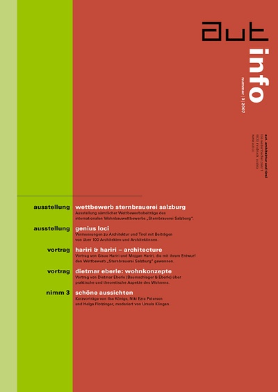 Die Ausgabe 3/07 der Programmzeitschrift aut: info mit Hintergrundinformationen zu den Ausstellungen „Wettbewerb Sternbrauerei Salzburg“ und „genius loci“ sowie zum Programm des aut zwischen Mai und Juni 2007.