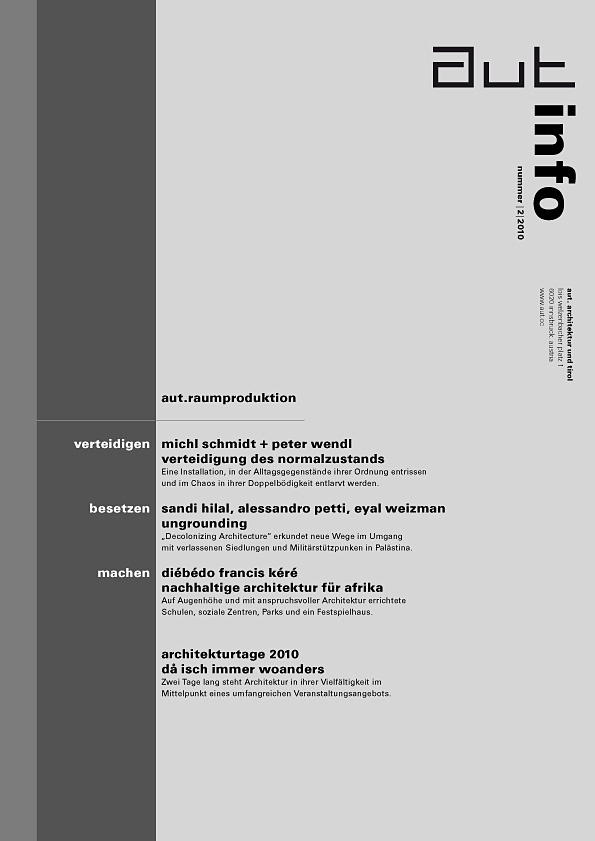 Diese Ausgabe der aut: info stellt drei weitere Positionen vor, die im Rahmen der von raumtaktik kuratierten „aut.raumproduktion“ gezeigt werden: Eine Installation von Michl Schmidt + Peter Wendl, in der Alltagsgegenstände ihrer Ordnung entrissen und im Chaos in ihrer Doppelbödigkeit entlarvt werden, ein Forschungsprojekt von Sandi Hilal, Alessandro Petti und Eyal Weizman, das neue Wege im Umgang mit verlassenen Siedlungen und Militärstützpunken in Palästina erkundet sowie ein Einblick in die von Diébédo Francis Kéré entwickelte nachhaltige Architektur für Afrika.