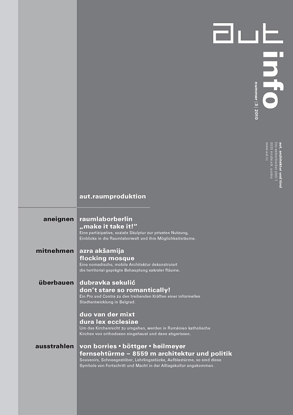 Diese Ausgabe der aut: info stellt fünf weitere Positionen vor, die im Rahmen der von raumtaktik kuratierten „aut.raumproduktion“ zu sehen sind: raumlabor berlin mit ihrer partizipativen, sozialen Skulptur „make it take it“, Azra Aksamija und ihr von der islamischen Ornamentik inspiriertes Projekt "Flocking Mosque", Dubravka Sekulics Auseinandersetzung mit der Überbauung der russischen Pavillons in Belgrad, Duo Van der Mixt und ihrer Dokumentation der Überbauung alter katholischer Kirchen in Rumänien sowie das Projekt „Fernsehtürme - 8559 m Architektur und Politik“ von Friedrich von Borries, Matthias Böttger und Florian Heilmeyer.
