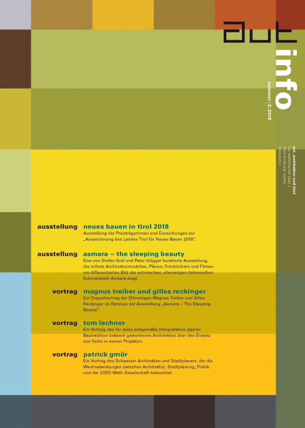Mit der Preisverleihung zur "Auszeichnung des Landes Tirol für Neues Bauen 2018" ist diese Ausgabe der aut: info erschienen. Zum einen sind damit sämtliche Siegerprojekte der "Auszeichnung des Landes Tirol für Neues Bauen 2018" abgebildet, die – wie sämtliche 71 zu diesem Architekturpreis eingereichten Projekte – bis Dezember in der Ausstellung "Neues Bauen in Tirol 2018" im aut zu sehen sind.