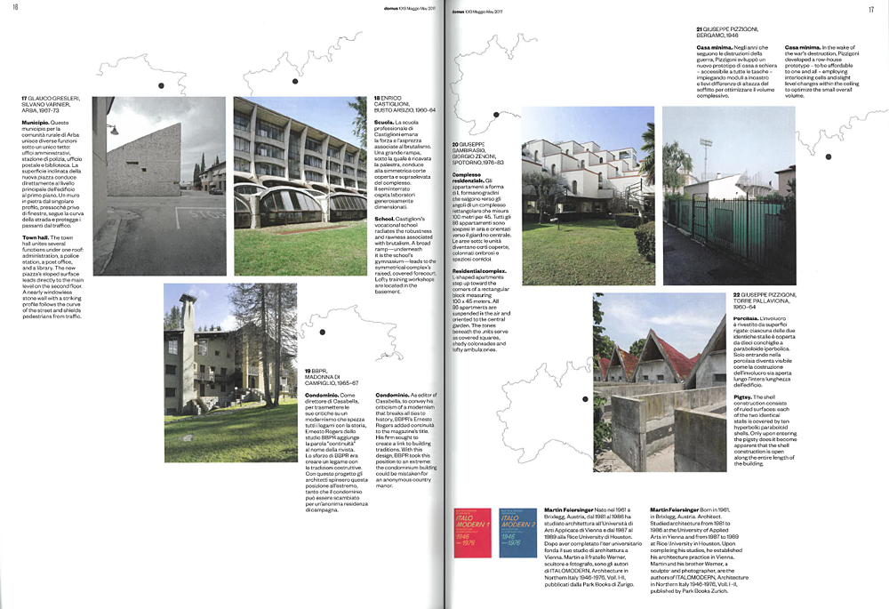 Sind die Ausstellungen und Publikationen „Italomodern 1“ und „Italomodern 2“ schon bisher auf großes internationales Interesse gestoßen und wurden begeistert in zahlreichen Medien rezensiert, so ist die im Mai 2017 erschienene 10-seitige Bild- und Textstrecke in der internationalen Ausgabe der Zeitschrift DOMUS eine ganz besondere Anerkennung für die jahrelange Arbeit unserer „Italomodernisten“ Martin und Werner Feiersinger.