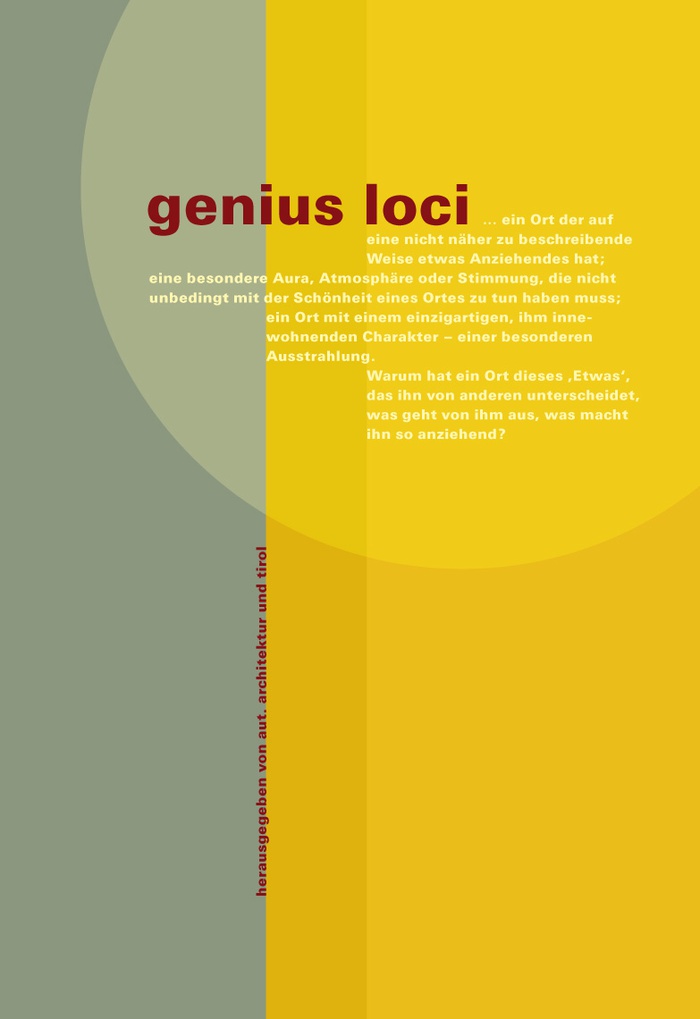 Die Annäherung an das Phänomen „genius loci“ führte eine Ausstellungsreihe fort, die – wie etwa "Haus Enzian" (1999), "ex libris" (2002) oder "sketches. Skizzen zu Architektur und Tirol" (2004) – die Wahrnehmung und den individuellen Zugang von ArchitektInnen zu einem Thema zu vermitteln versucht. Mit der nun vorliegenden Publikation wird das jüngste Projekt dieser Reihe einer interessierten Leserschaft zugänglich gemacht.