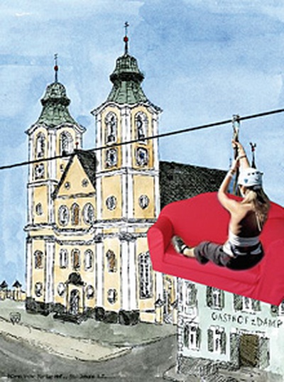 Mit einem Sofa im Gepäck machen wir uns auf den Weg durch St. Johann und lassen uns dort nieder, wo es uns gefällt.