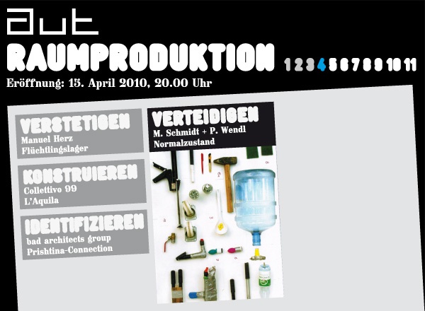 Mit der Ausstellung "Michl Schmidt + Peter Wendl: Verteidigung des Normalzustands" setzt sich die über das ganze Jahr 2010 gezeigte Ausstellungsreihe aut.raumproduktion fort.
