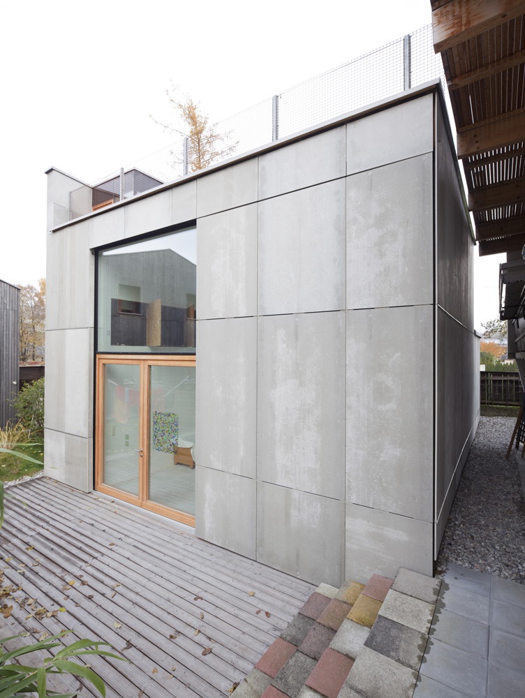 Im Zuge der Sanierung und Aufstockung des bestehenden Elternhauses durch Madritsch Pfurtscheller wurde das kleine Atelierhaus als eigenständiger Baukörper in den Garten gestellt. Der in Holzbauweise ausgeführte Kubus ist leicht in den Boden versenkt und bietet Platz für einen ca. 5 m hohen Hauptraum, diverse Neben- und Lagerräume sowie einen zusätzlichen Arbeitsraum auf der Dachterrasse. Der Atelierraum öffnet sich großzügig nach Süden, bei Bedarf kann die Verglasung durch eine Schiebetür aus dem Fassadenmaterial (zementgebundene Spanplatten) komplett geschlossen werden.