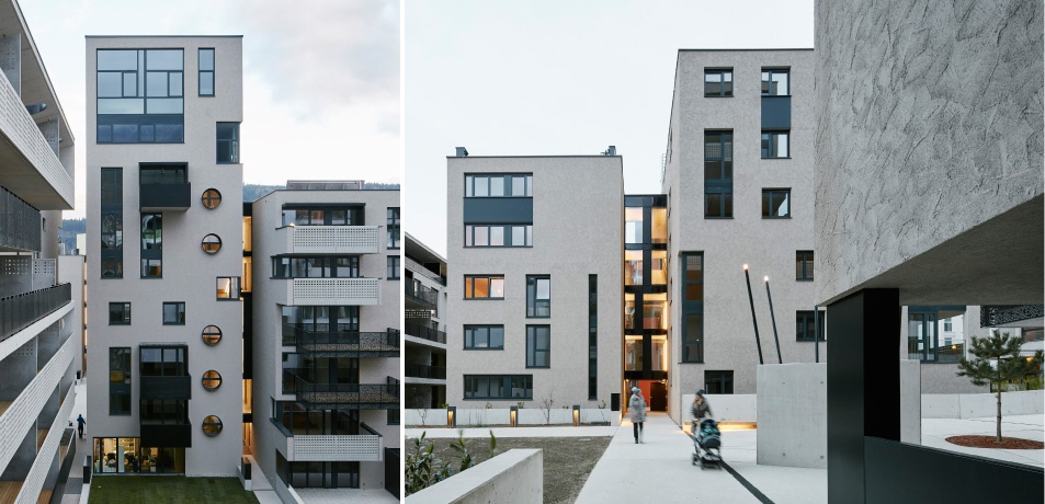 Zum Teil direkt an die vorhandenen Feuermauern der angrenzenden Bauten angefügt, sind mehrere langgezogene Bauteile unterschiedlicher Höhe versetzt zueinander platziert. Die an den Rändern eher niedere Zeilenstruktur verdichtet sich in punktuellen Erhöhungen Richtung Mitte. Eine Abfolge an unterschiedlich erlebbaren Zwischen und Freiräumen führt in diese neue Mitte des Quartiers, die als öffentlicher Raum an den vorhandenen Fuß- und Radweg angeschlossen werden soll. Die spielerische Anordnung der Baukörper findet ihre Fortsetzung in einer lebendigen Gestaltung der Fassaden mittels Fenstern unterschiedlicher Größe, Form und Anordnung.
