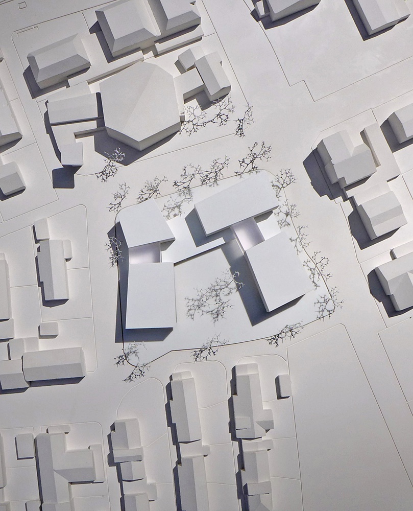 Der zurückhaltend gestaltete Baukörper nimmt die unterschiedlichen Ausrichtungen der vorhandenen Bebauung auf, bildet Richtung Vorplatz der Kirche einen „Dorfplatz“ aus und umschließt nach Westen U-förmig einen großzügigen Hof. Über dem Erdgeschoss, indem sich neben Gemeinschaftsräumen auch ein Café, eine Kinderkrippe und Praxisräume befinden, ist er in zwei viergeschossige Bauteile aufgelöst, die wiederum durch ein gemeinsames Stiegenhaus untergliedert sind. An die Erschließungskerne angebunden gibt es in jedem Geschoss großzügige Begegnungszonen für jeweils 8 bis 9 Wohnungen, die in vielfältigen Typologien angeboten werden.