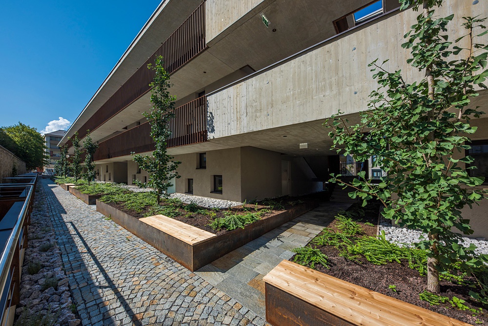Ursprünglich befanden sich auf dem großen Innenhof zwischen Speckbacherstraße, Schöpfstraße, Andreas-Hofer-Straße und Franz-Fischer-Straße ein Parkplatz und ein Bürogebäude. Mit dem Ziel einer möglichst geringen Beeinträchtigung der Anrainer entstand der Neubau mit ca. 120 Wohnungen nach dem Konzept einer „sunken plaza“, d. h. als Verdichtung nach unten. Zwei unterirdische Wohngeschoße öffnen sich zu einem abgegrabenen Innhof, die drei Obergeschoße wurden auf mehrere einzelne Häuser mit begrünten Dächern und Fassaden verteilt. Die 1- bis 4-Zimmer-Wohnungen bieten mit gut durchdachten Grundrissen viel Platz auf wenig Raum. Jeder Einheit – von den atelierartigen Erdgeschoßwohnungen bis zu Dachgeschoßapartments mit dreiseitiger Belichtung – ist ein privater Freiraum in Form von Gartenflächen, Balkonen und Terrassen zugeordnet.