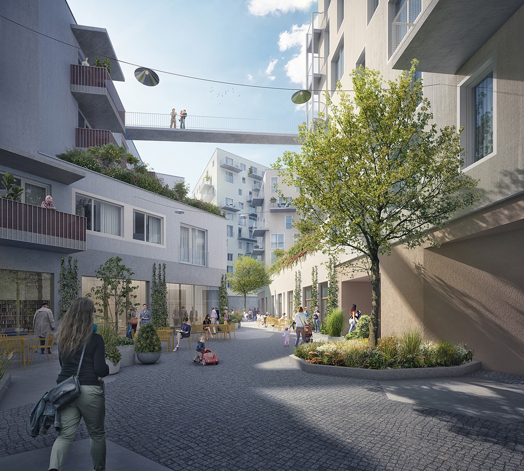 Den Wettbewerb für das erste Baufeld konnte 2017 Bogenfeld Architektur mit einem Projekt gewinnen, das auf der Grundidee eines Wohnzimmers im Freien beruht. Zwischen vier Baukörpern unterschiedlichsten Zuschnitts schaffen sie eine Abfolge von Gassen und Plätzen für ein lebendiges Miteinander. Auch auf den Dächern gibt es gemeinsame Gärten, die durch eine Gehbrücke miteinander verbunden sind. Die Umsetzung der vier Bauteile – jeweils zwei für die IIG und zwei für die Neue Heimat Tirol – erfolgt im Sinne der architektonischen Vielfältigkeit gemeinsam mit Harald Kröpfl, Ralf Eck und Christoph Eigentler, den Zweitplatzierten des Architekturwettbewerbs.