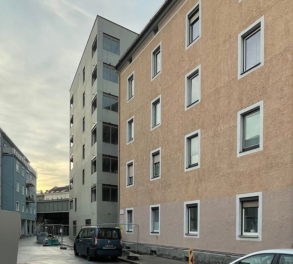 Auf dem spitzwinklig zulaufenden Grundstück platzierten Giner + Wucherer ein kompaktes, 7-geschoßiges Volumen, das als Solitär vom Bestand abgesetzt ist. Im Unterschied zu dessen Putzfassade erhielt der in Massivbauweise errichtete Baukörper eine Fassade aus sichtbar belassenen Betonhohlwänden der Firma PROGRESS. Die unteren drei Ebenen werden von der Sozialeinrichtung „promente tirol“ für Begleitetes Wohnen mit Tagesstruktur genutzt, darüber liegen weitere 17 kostengünstige Mietwohnungen und ganz oben ein gemeinsamer Dachgarten.