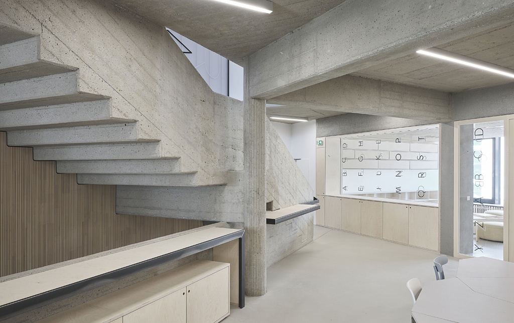 Im Zuge der jüngsten, von STUDIO LOIS durchgeführten Sanierungs-, Umbau und Erweiterungsmaßnahmen wurde dieser heterogene Bestand einer Bereinigung und Reduktion unterzogen. So wurde das „Sammelsurium“ der verschiedenen Bauphasen, Fassaden und Höhenentwicklungen des Gelenkbaus zwischen altem Hauptgebäude und Pfarrkirche in einer zeitgemäßen Fassade aus transluzenten Polycarbonatplatten zusammengefasst. Die Räume der Volksschule wurden durch große Fenster geöffnet, der Innenraum auf seine Betonstruktur zurückgeführt und mit naturbelassenen Werkstoffen ergänzt. Als weitere wesentliche Maßnahme wurde im Außenbereich der Zaun entfernt, womit der schuleigene Freiraum zusammen mit dem öffentlichen Stadtraum eine große, kollektiv zugängliche Fläche bildet.