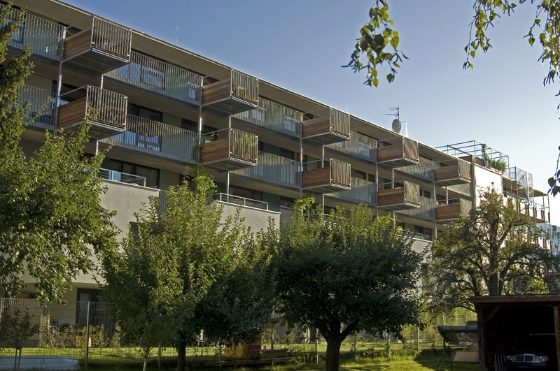 Die ArchitektInnen reagierten auf diese Anforderungen, indem sie verschiedene Wohnungstypen mit jeweils variablen Grundrissen entwickelten, die an unterschiedlichste Wohnbedürfnisse angepasst werden können: Große Wohnungen mit umlaufenden Balkonen im Westen, als „Häuser“ konzipierte, über eigene Gartentore und Vorgärten erschlossene Maisonnettewohnungen in den Untergeschossen und großteils 50 m2 große Einheiten in den Obergeschossen, die je nach Bedarf als großzügiger Einraum oder mit bis zu zwei Schlafzimmern bewohnt werden können.
