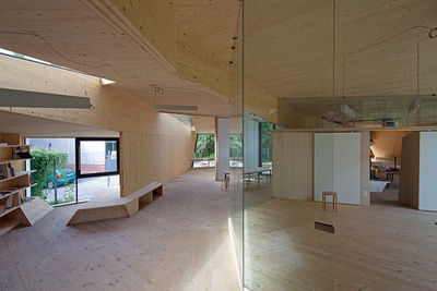 Entstanden ist ein pavillonartiges Werkstättengebäude, das nicht nur den Kindern und Jugendlichen als NutzerInnen ein optimales Raumangebot bietet, sondern auch den Park durch seine einzigartige Architektur bereichert. Vorgelagerte Terrassen und raumhohe Glasfronten verbinden den geschwungenen Baukörper mit der Umgebung, im Inneren bilden schräge Böden und Wände ein fließendes Kontinuum an Räumen mit unterschiedlichen Atmosphären und Arbeitsmöglichkeiten.